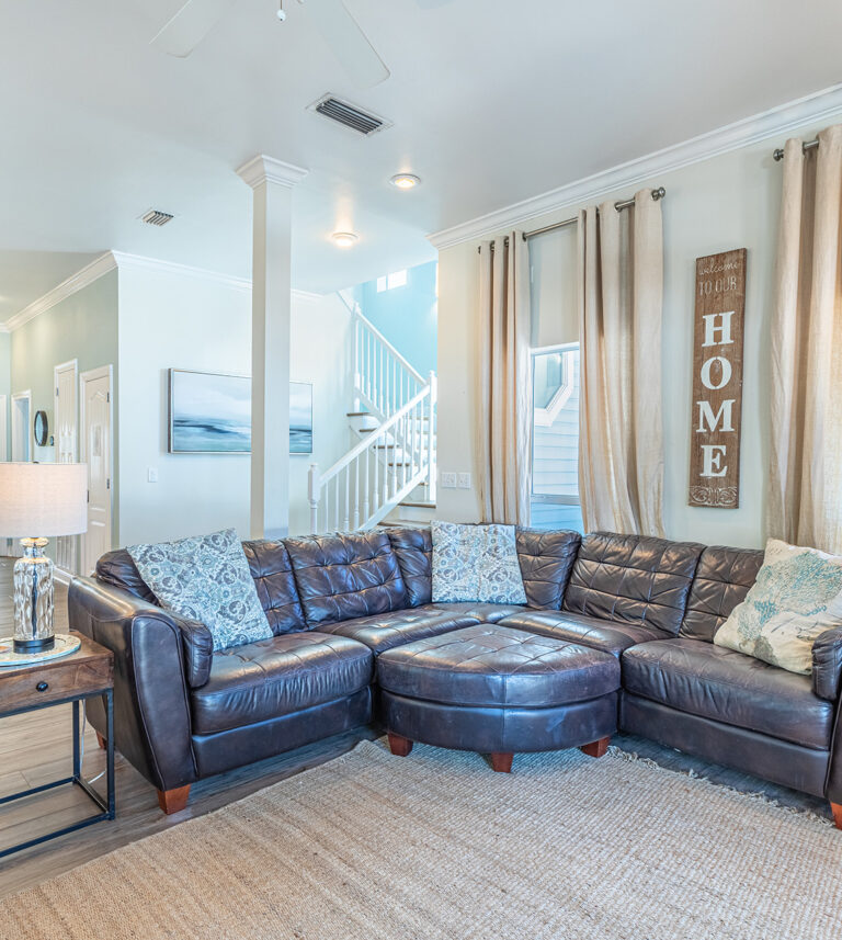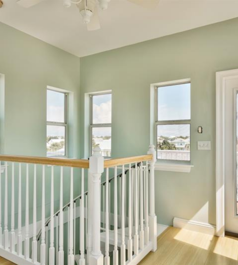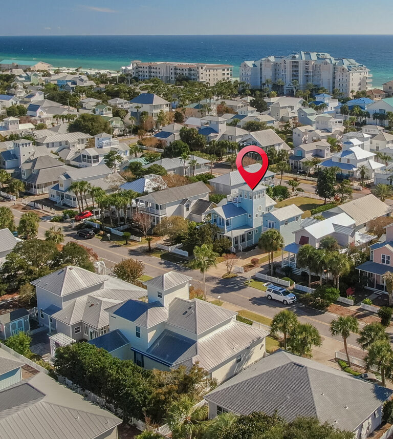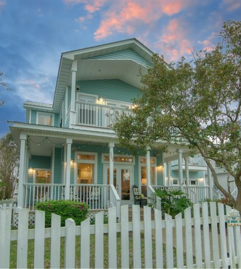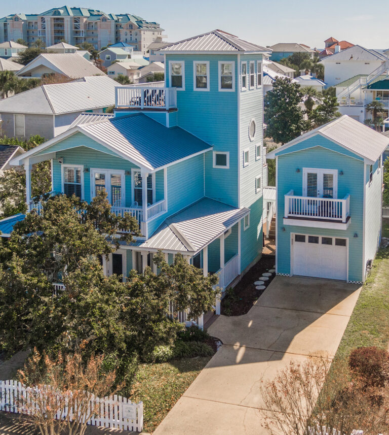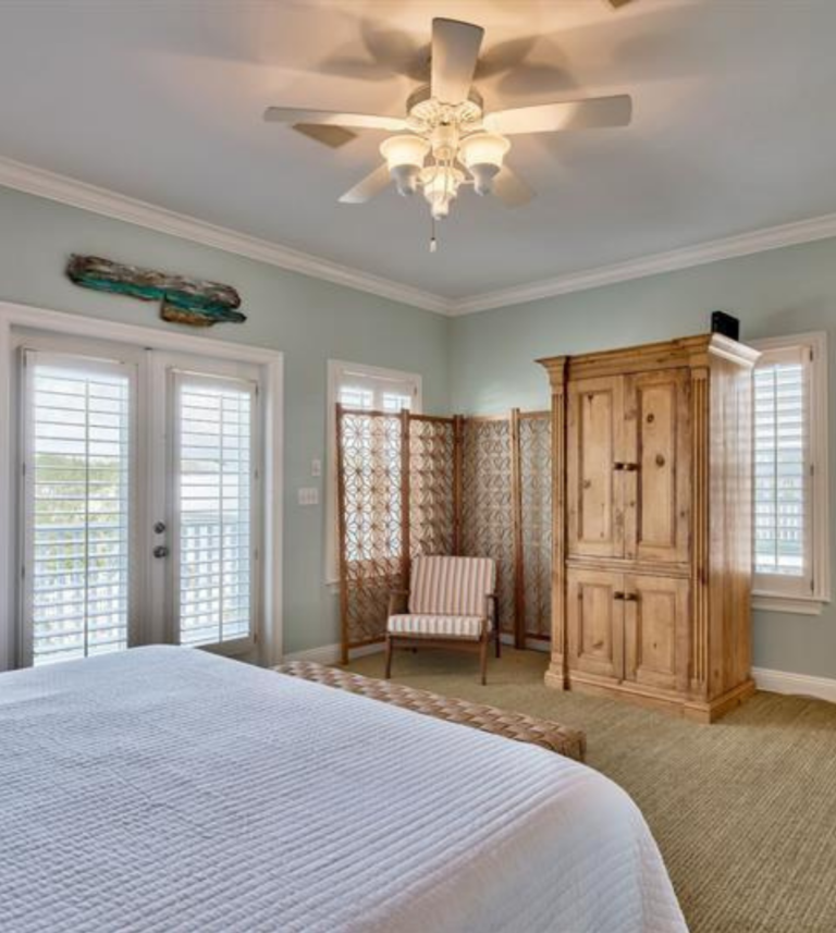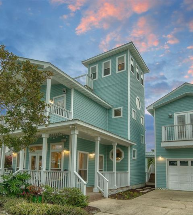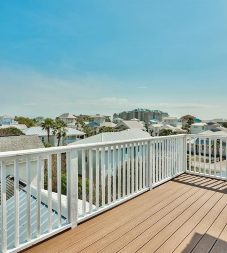 The 2400 square foot home features a spiral staircase leading to a third story observation deck with a view of Crystal Beach and a peek at the emerald waters of the Gulf of Mexico!
