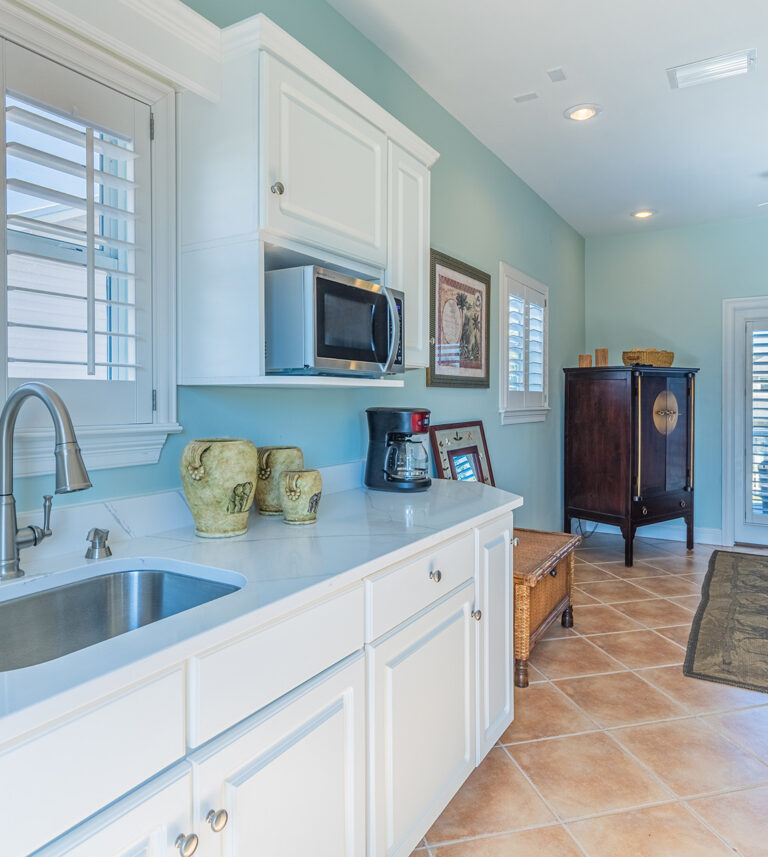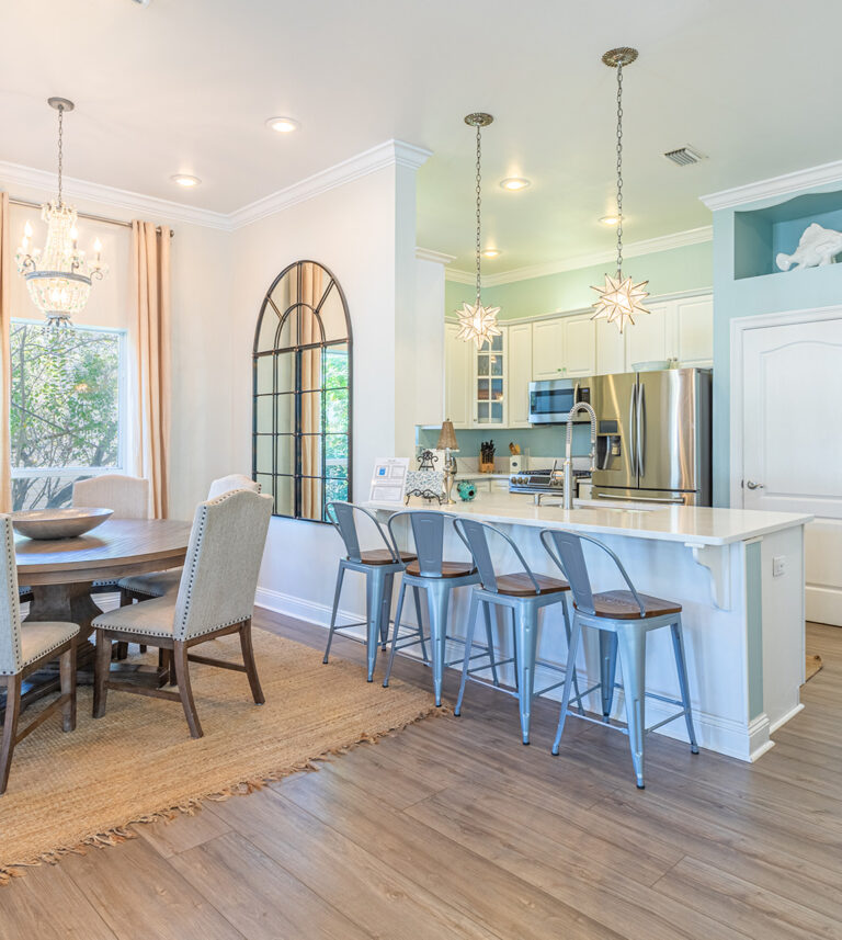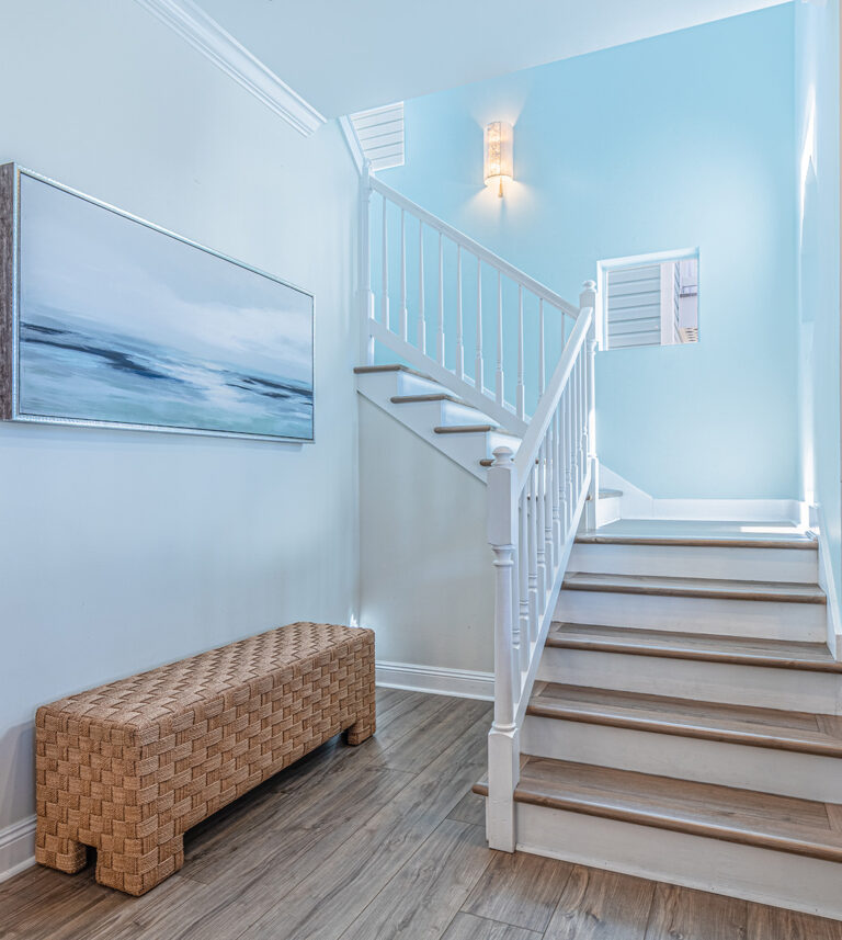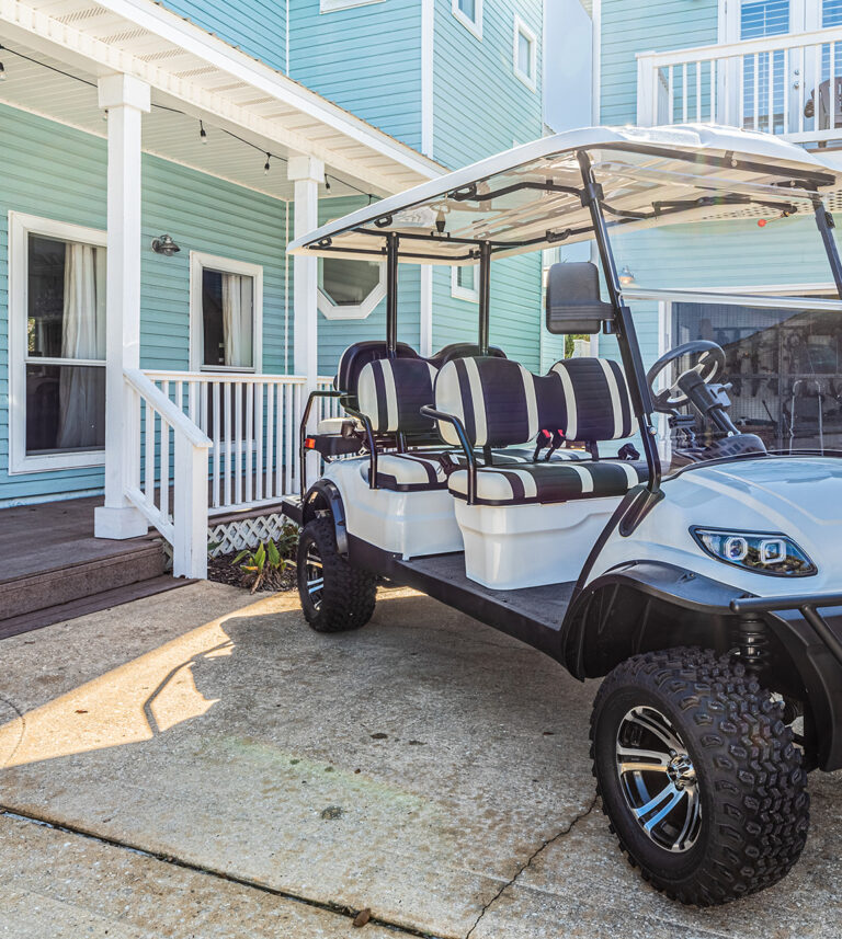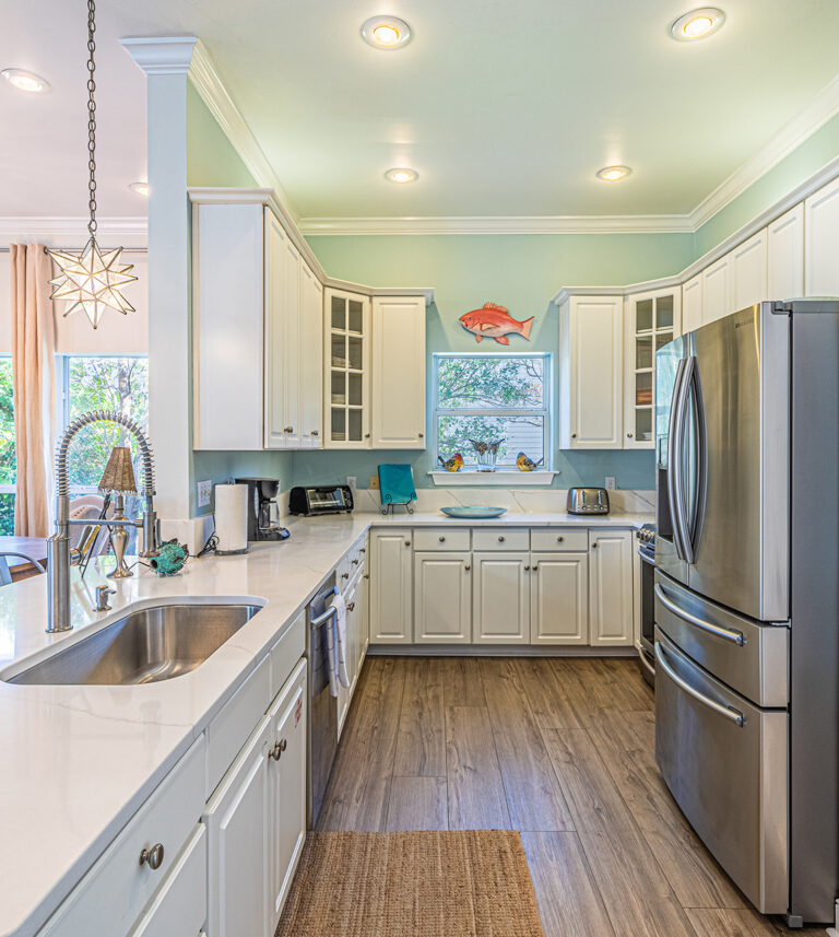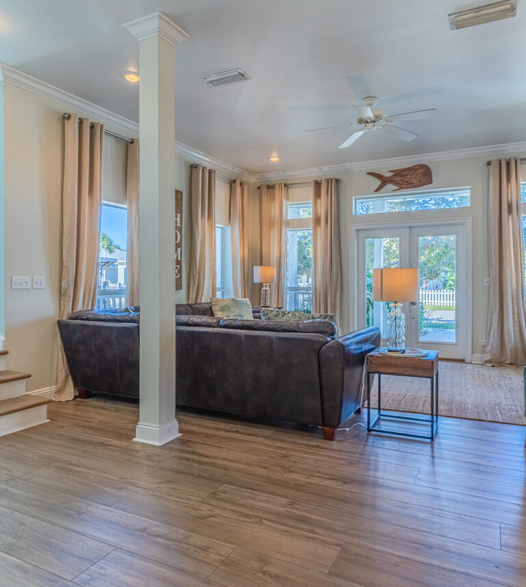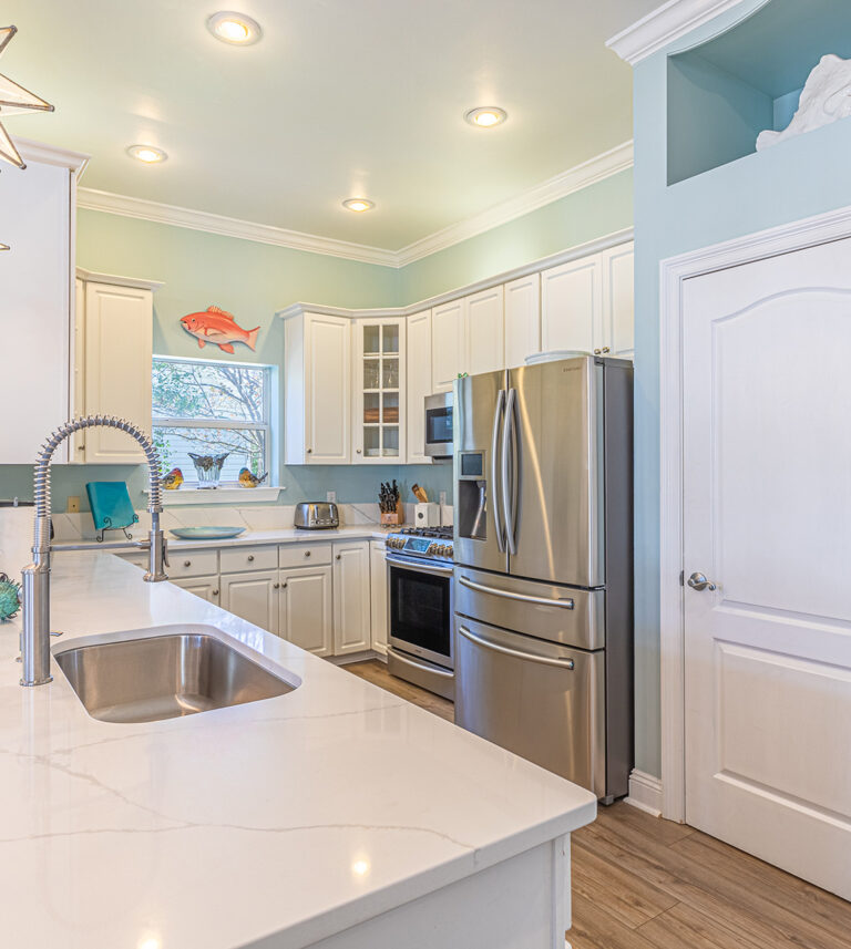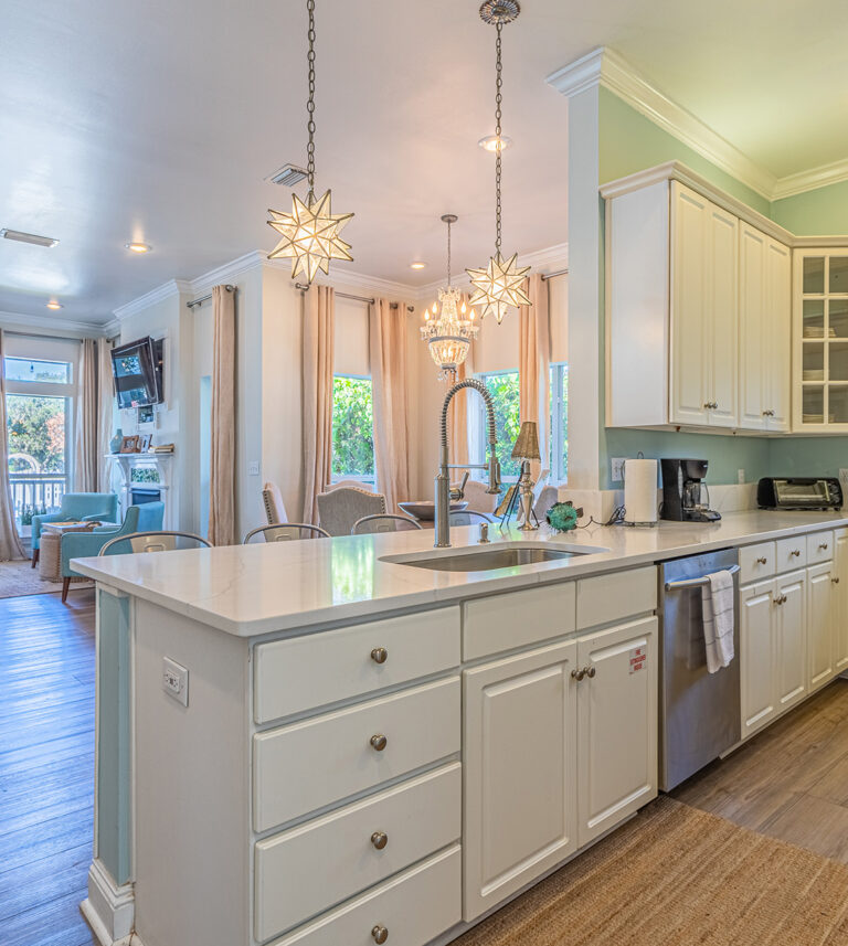 The 2400 square foot home features a spiral staircase leading to a third story observation deck with a view of Crystal Beach and a peek at the emerald waters of the Gulf of Mexico!